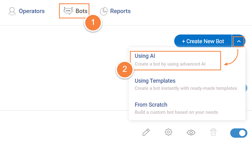 1. First, go to the Bots section on your ProProfs Chat dashboard, click on +Create New Bot, and select Using AI from the dropdown.
