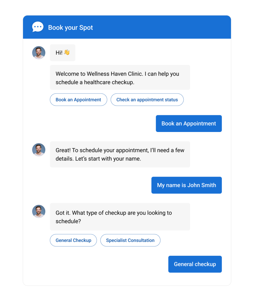 Plus, providing quick-select options like “Book an Appointment” or “Check an Appointment Status” helps users avoid typing long messages, making communication faster and more accurate.
