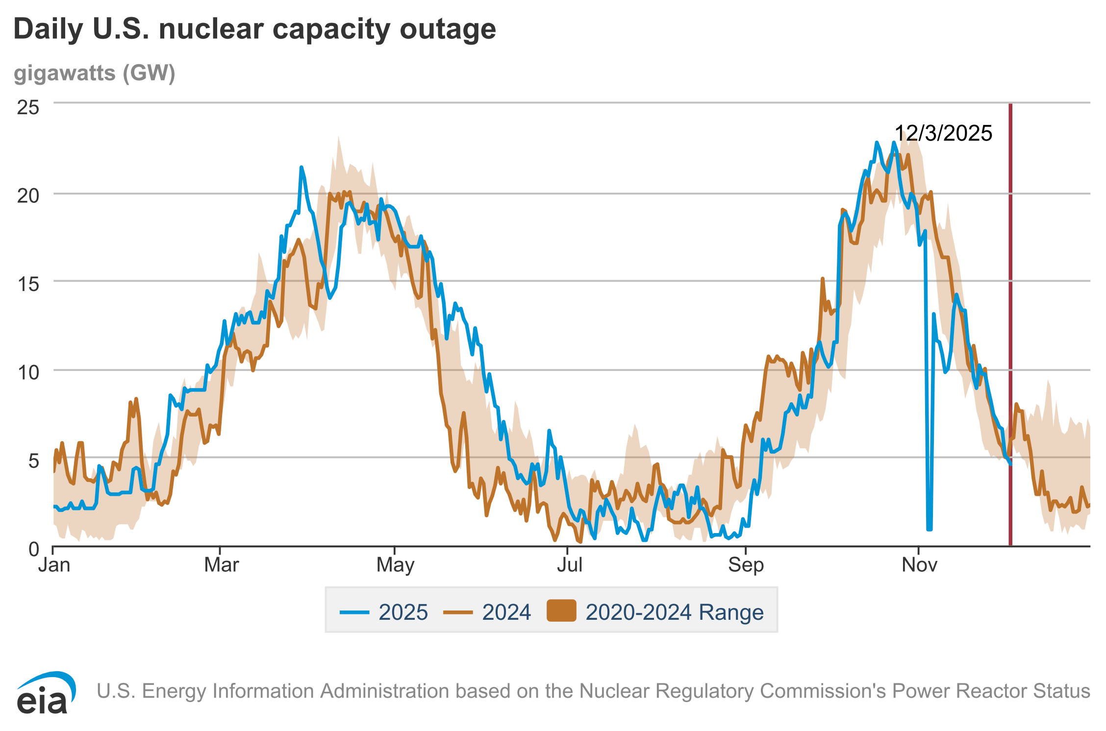 Here in the US, nuclear reactors follow predictable seasonal trends. Summer and winter tend to see the highest electricity demand, so plant operators schedule maintenance and refueling for other parts of the year.